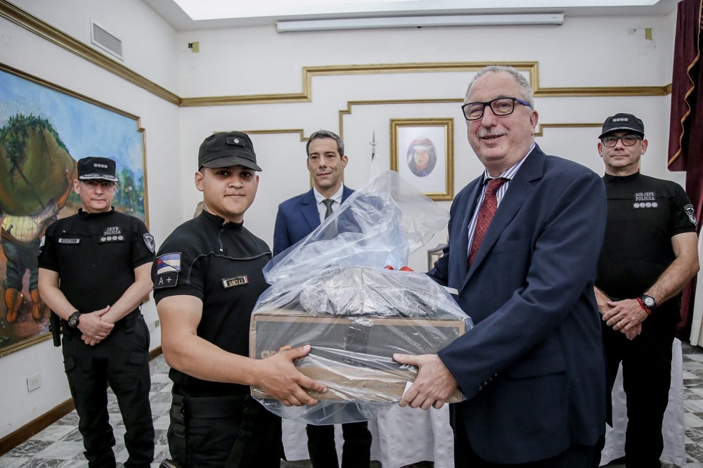 En esta ocasión, la dotación entregada consistió en 6.000 remeras, 6.000 pantalones, 300 chaquetillas, 300 cinturones y 500 chombas refractarias blancas para la División de Seguridad Vial y Turismo, además de 100 capas de lluvia. El equipamiento se completa con borceguíes y kepis que serán entregados en un plazo de 15 días.
