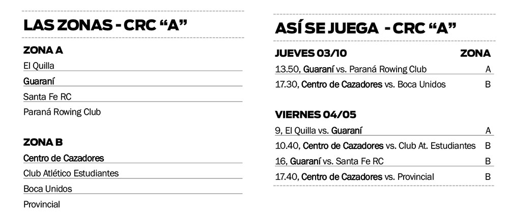 Con ese objetivo en mente, su periplo arrancará mañana a las 13.50 ante Paraná Rowing Club, en el único duelo que se disputará el día del arranque del certamen. Luego, volverá a competir el viernes, desde las 9 ante El Quilla y cerrará su participación en la fase de grupos ese mismo día, a partir de las 16, ante Santa Fe RC.