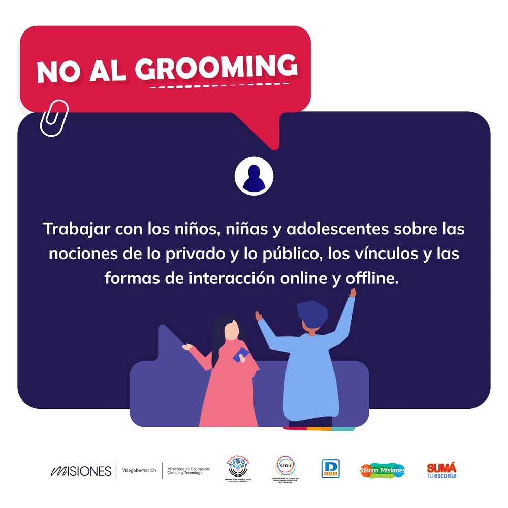 Desde el 3 de octubre al 14 de noviembre se realizará campaña de prevención y concientización sobre el grooming, con el objetivo de proteger a niños y jóvenes de esta forma de acoso digital. Esta herramienta fue coordinada en conjunto entre Vicegobernación, el Ministerio de Educación, la Cámara de Representantes y Silicon Misiones.