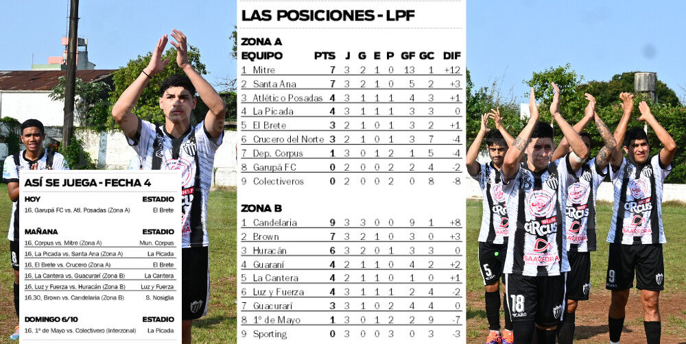 El grueso del capítulo se llevará adelante mañana. Por la Zona A, Deportivo Corpus recibirá a Mitre, uno de los punteros del grupo junto a Santa Ana, el otro líder que en la misma jornada tendrá enfrente a La Picada. También por esta misma llave, El Brete se medirá con Crucero del Norte, en su cancha de San Isidro.