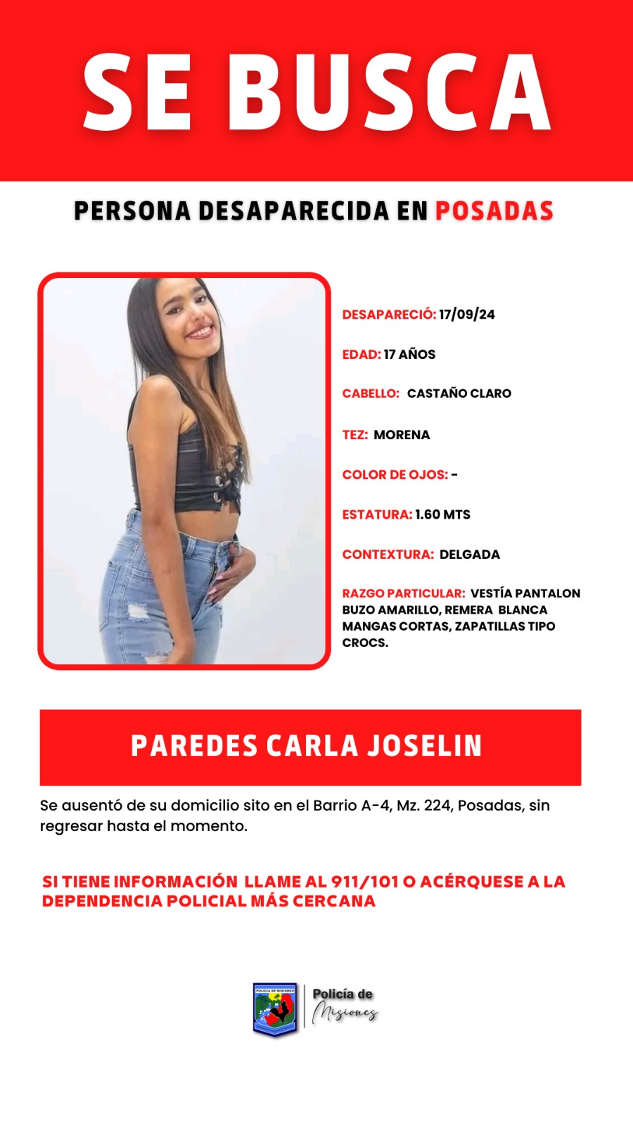 La Policía de Misiones emitió un alerta para localizar a Carla Joselin Paredes, una joven de 17 años que fue vista por última vez el pasado 17 de septiembre.