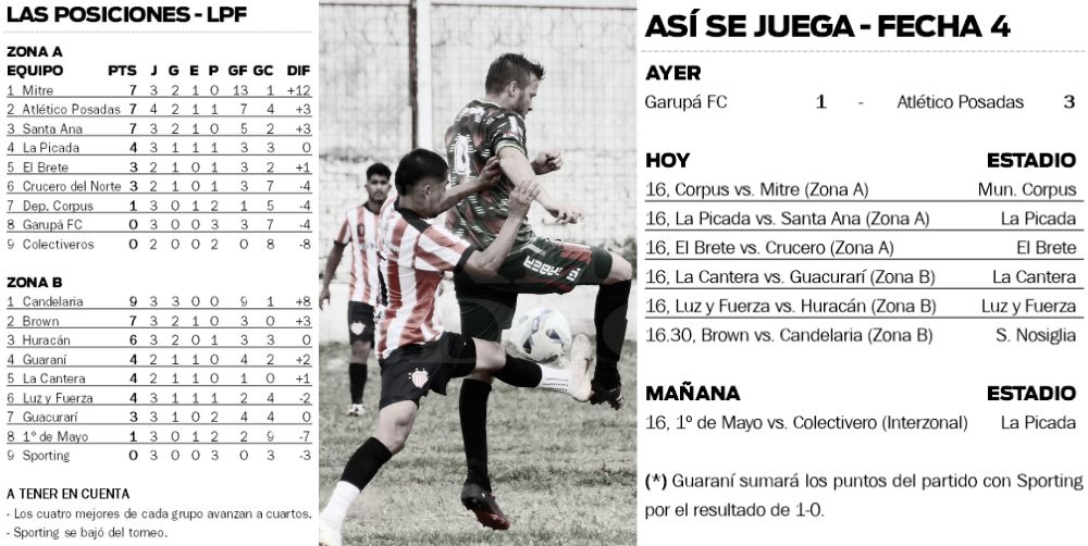 Mañana seguirá la acción con un solo choque: 1º de Mayo vs. Colectivero, el interzonal que también está pautado para las 16. Este cuarto episodio se puso en marcha ayer, con la victoria 3-1 de Atlético Posadas sobre Garupá FC, que hizo las veces de local en cancha de El Brete.
