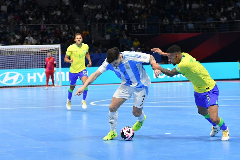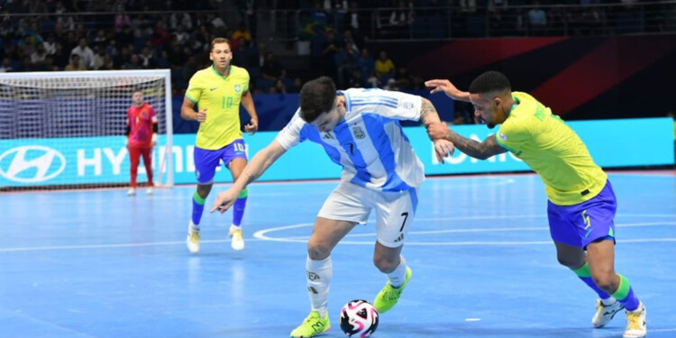 La selección argentina cae 2-0 ante su par de Brasil, al término del primer tiempo de la final del Mundial de Futsal de Uzbekistán 2024.