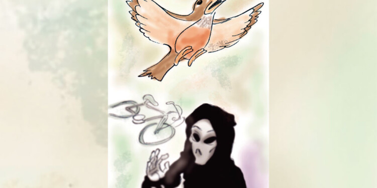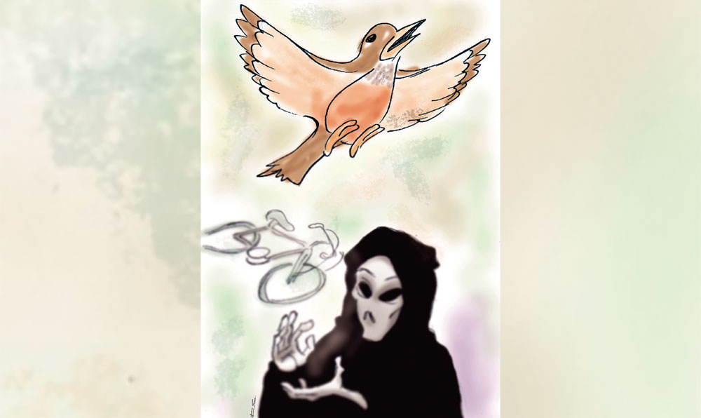 La muerte lo toma. De entre sus manos, surge un pajarito de cuerpo amarillo y dorso rojo anaranjado con garganta blanquecina y estriada que termina en un pico recto del que sale un fino e incansable acorde llamando a su familia.