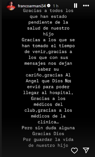 Recién después de eso, Armani publicó: “Gracias a todos los que han estado pendiente de la salud de nuestro hijo. Gracias a los que se han tomado el tiempo de venir, a los que con sus mensajes, no dejan saber su cariño. Gracias al ángel que Dios nos envió para poder llegar al hospital. Gracias a los médicos del club, gracias a los médicos de la clínica pero sin dudas, gracias a Dios por guardar la vida de nuestro hijo”.