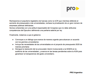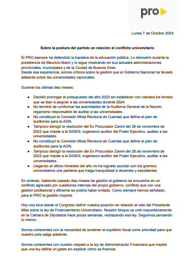 Aunque la decisión final del espacio es apoyar el veto de Milei, el partido que lidera Mauricio Macri no se ahorró críticas a la gestión de Milei en estos primeros diez meses de Gobierno y le pidió que “incluya las necesidades de las universidades en el proyecto de Presupuesto 2025 de manera prioritaria”.