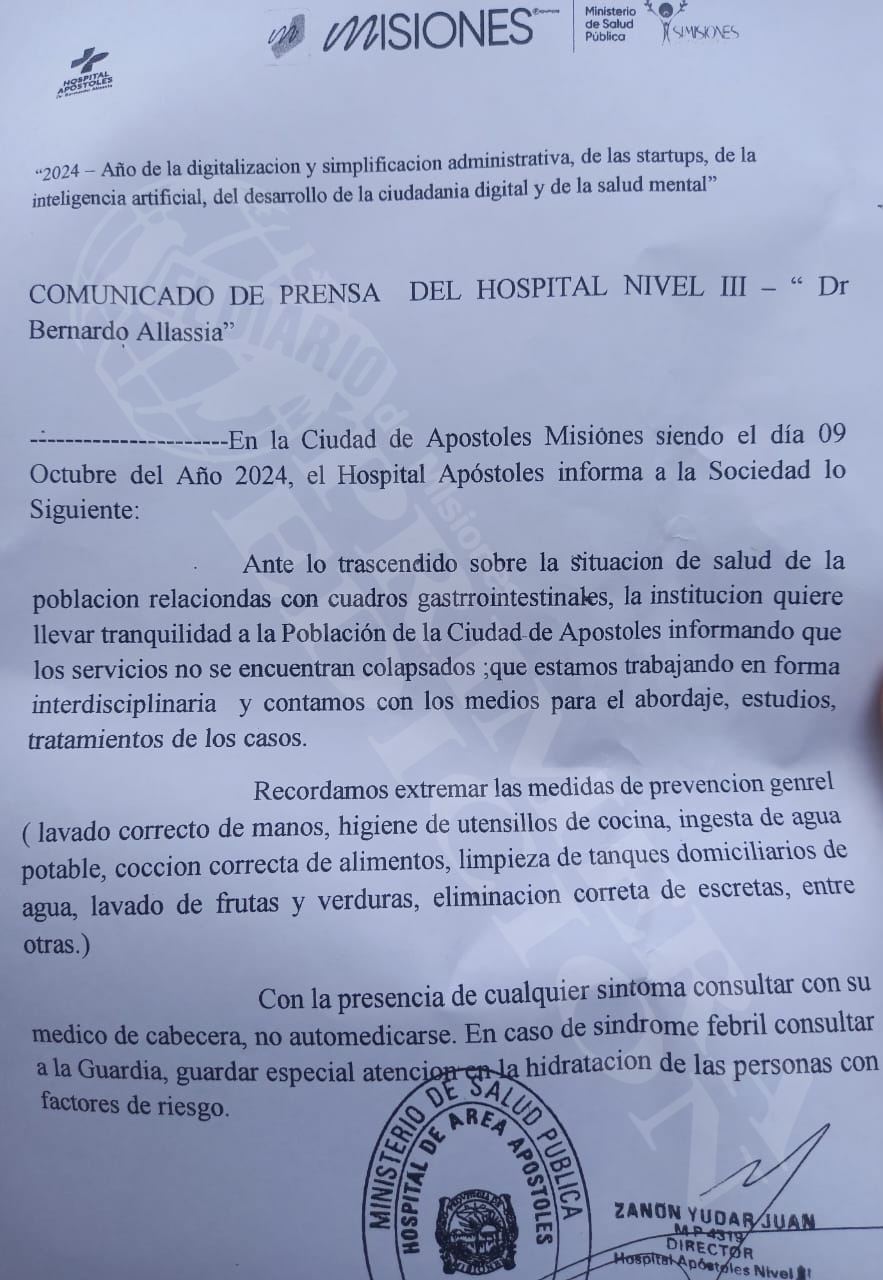Si bien en un momento trascendió que el servicio de salud pública se encontraba colapsado, esto fue desmentido por el propio Hospital de Nivel III de Apóstoles a través de un comunicado.