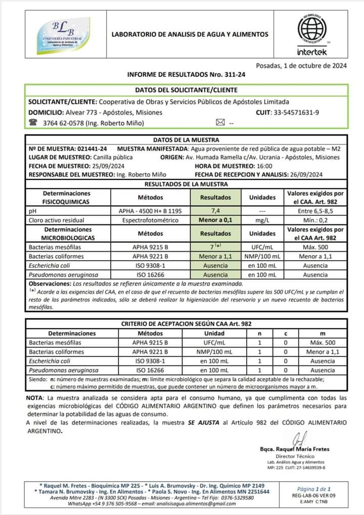 En este sentido, el presidente de la cooperativa explicó a PRIMERA EDICIÓN que “podemos darle la tranquilidad al socio de COSPAL venimos haciendo los tratamientos potabilizadores y análisis semanarios igual que se hacen siempre, yo compartí el análisis de la semana pasada donde dan elementos contaminantes cero”, destacó.