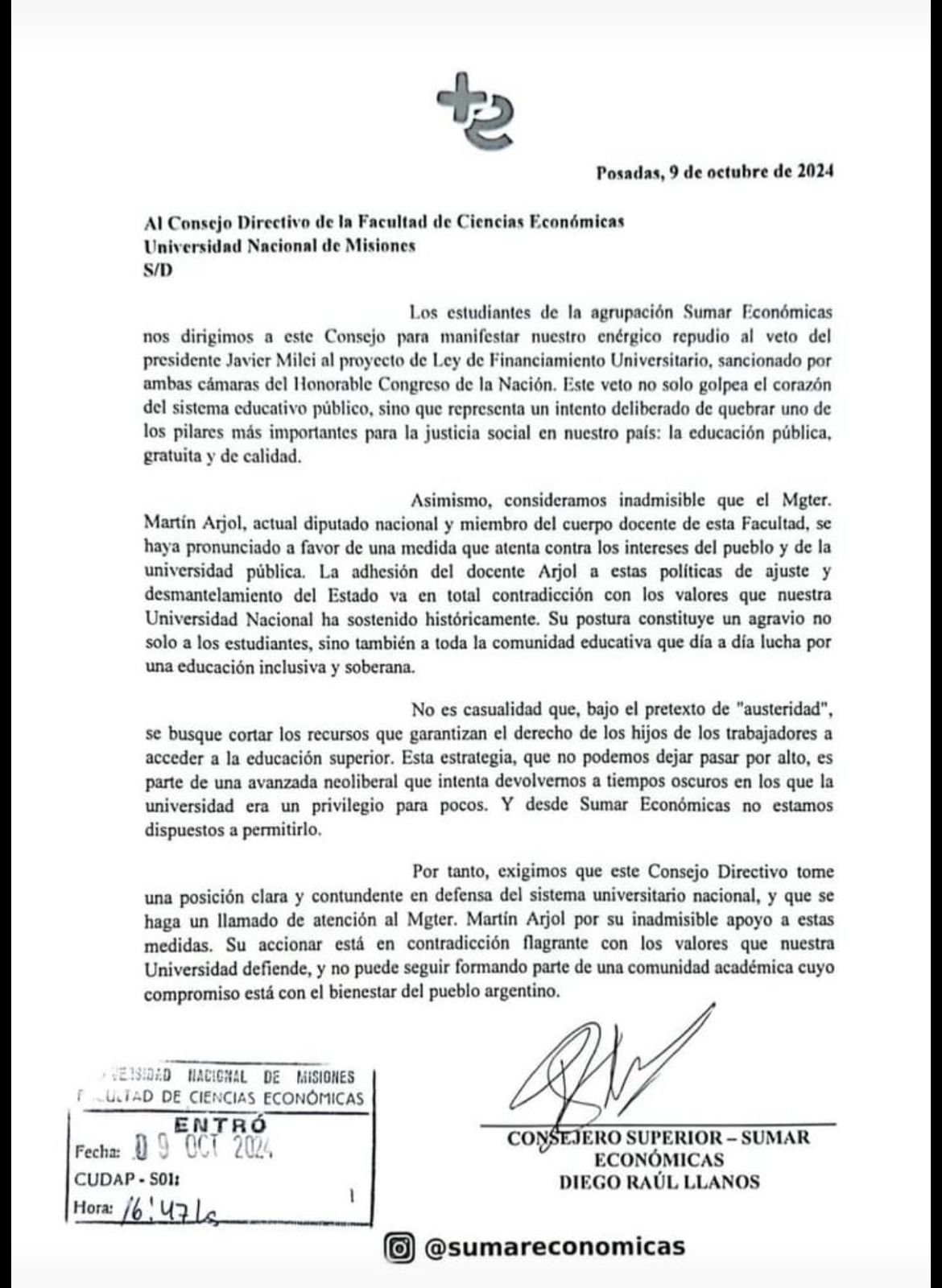 En una nota dirigida a las autoridades de esa casa de estudio, la agrupación Sumar Económicas expresó que la postura de Arjol constituye un “agravio” no solo a los estudiantes, sino también a “toda la comunidad educativa, que día a día lucha por una educación inclusiva y soberana”.
