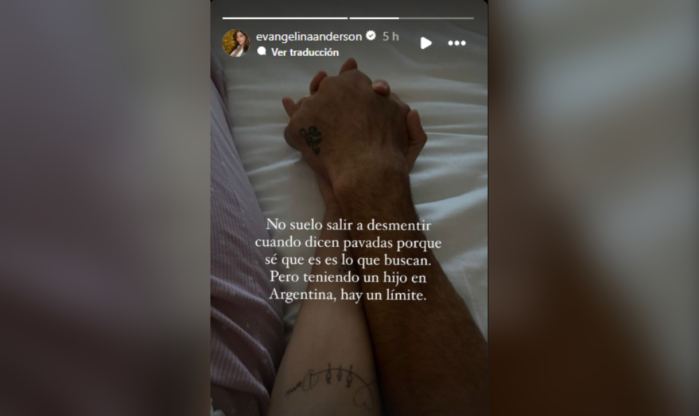 Lo hizo a través de una publicación en sus historias de Instagram, donde respondió a los rumores. Evangelina optó por romperlo de manera tajante. En la madrugada de este jueves publicó una foto que decía más que mil palabras. Era una imagen sencilla, pero poderosa: las manos de ambos, entrelazadas, como símbolo de la unión que, según ella, aún persiste. Junto a la imagen, escribió un mensaje directo: “Teniendo un hijo en Argentina, hay un límite”.