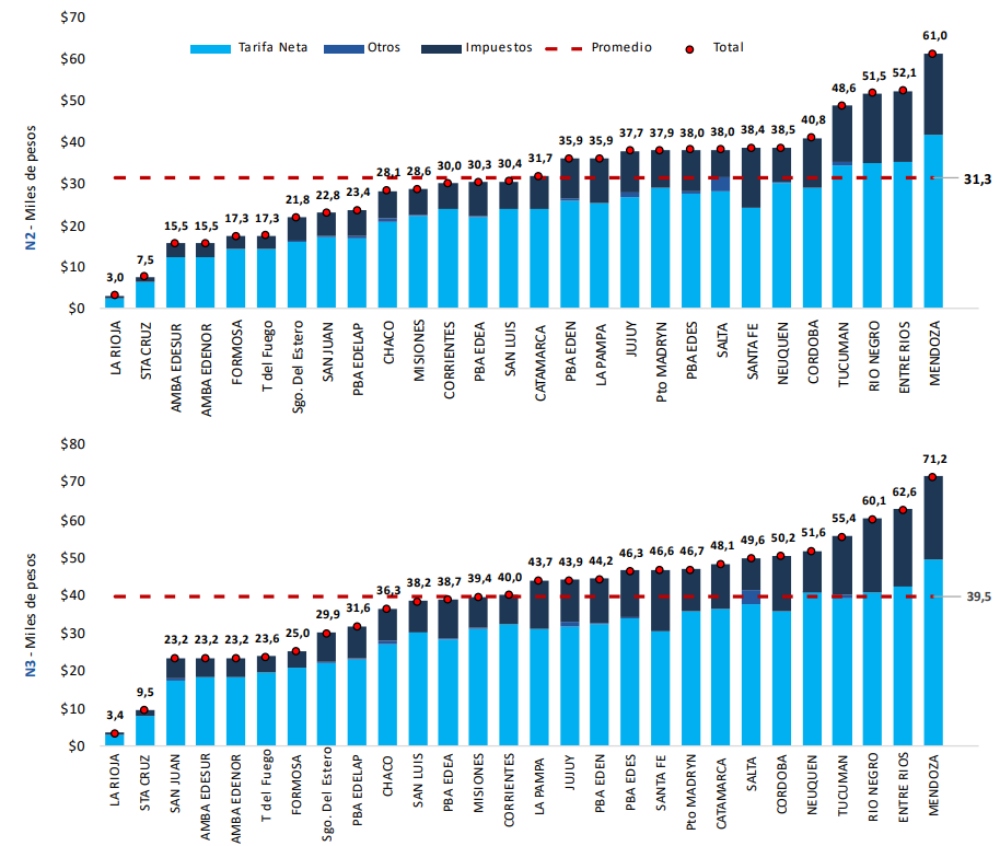 En la categoría N2, que son los usuarios de más bajos ingresos, el ranking vuelve a estar encabezado por Mendoza, donde un usuario que consumió 300 kilowatts hora pagó 61 mil pesos. El promedio del país es de 31.300 pesos, y en Misiones, un usuario con ese consumo debió pagar 28.600 pesos. Otra vez La Rioja se encuentra con la tarifa más baja, ya que solo alcanza los 3 mil pesos.