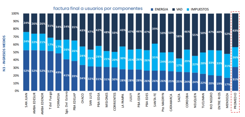 A la vez, el componente de energía en Misiones es de 31% y el componente de VAD (Valor Agregado de Distribución) es de 48%, que es lo que agregan las distribuidoras locales para sus costos. A nivel nacional el promedio es 31% de energía y 43% de VAD.