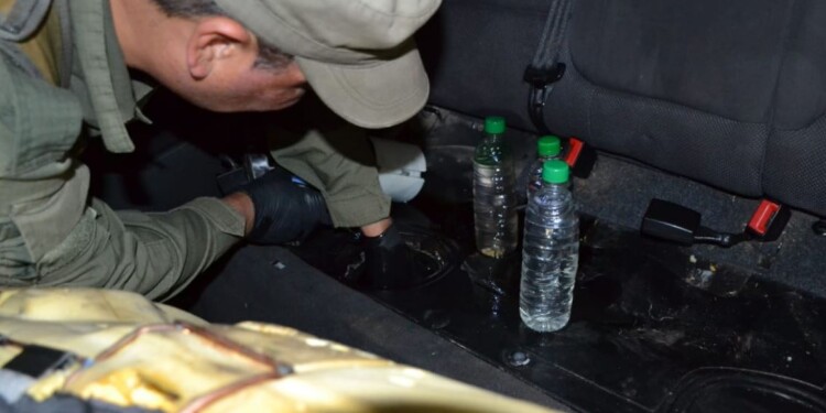 Ante la posibilidad de estar frente a un delito, los agentes inspeccionaron minuciosamente el automóvil en presencia de testigos, descubriendo que la tapa de la bomba de combustible había sido manipulada. Al revisar el tanque, encontraron 70 botellas plásticas ocultas que contenían una sustancia líquida traslúcida.