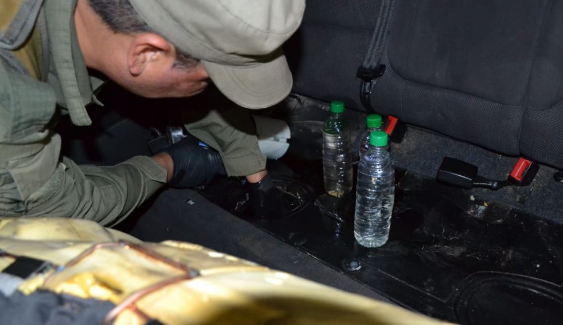 Ante la posibilidad de estar frente a un delito, los agentes inspeccionaron minuciosamente el automóvil en presencia de testigos, descubriendo que la tapa de la bomba de combustible había sido manipulada. Al revisar el tanque, encontraron 70 botellas plásticas ocultas que contenían una sustancia líquida traslúcida.