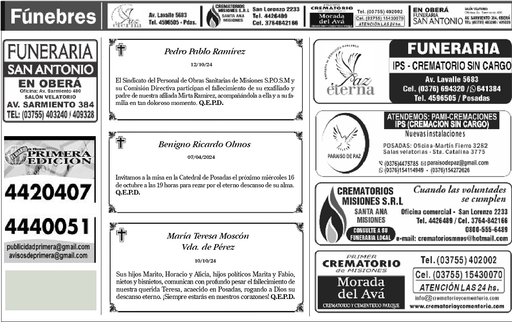• Fúnebres del sábado 12 de octubre de 2024
