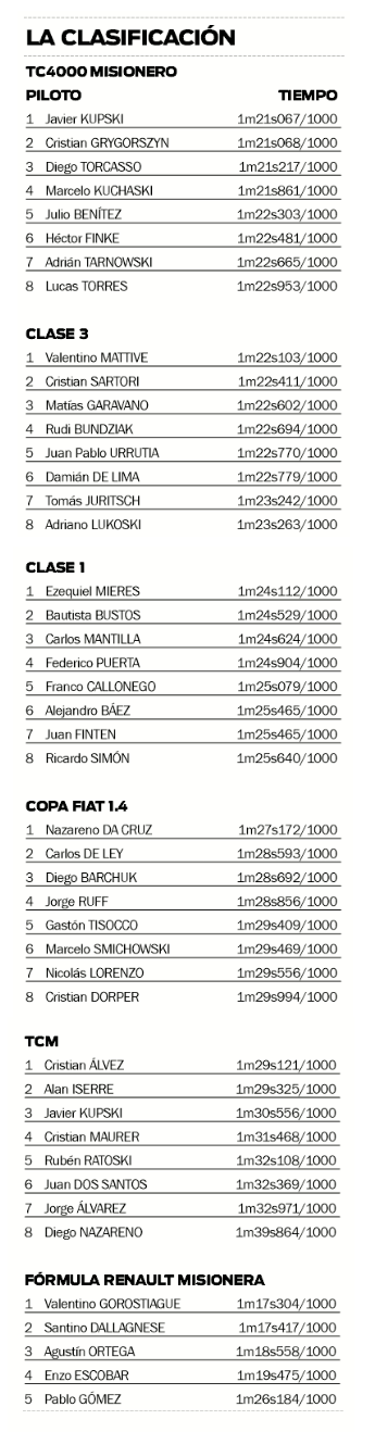En cuanto a las otras dos categorías, en el TCM el puntero Cristian Álvez se quedó con la pole position; mientras que en la Fórmula Renault Misionera, el puntero Santino Dallagnese escoltó al poleman Valentino Gorostiague.