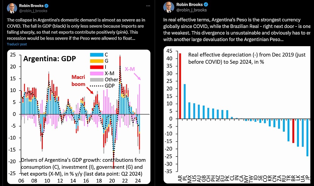 “En términos reales, el peso argentino es la moneda más fuerte del mundo desde la pandemia, mientras que el real brasileño, que está justo al lado, es una de las más débiles. Esta divergencia es insostenible y, obviamente, tiene que terminar con otra gran devaluación del peso argentino”, había publicado hace diez días Brooks en su cuenta en la red social X, adjuntando aquella vez un gráfico sobre la apreciación o depreciación de distintas monedas respecto del dólar de EEUU.
