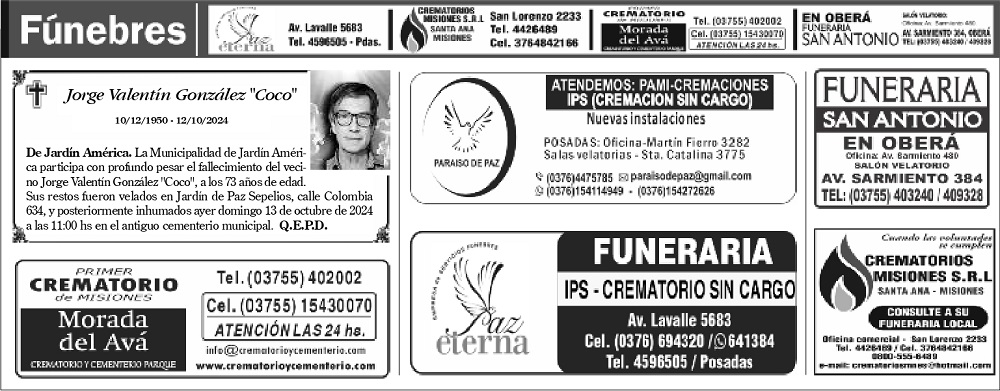 • Fúnebres del Domingo 13 de Octubre de 2024