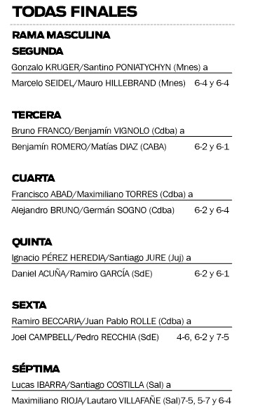En Quinta, los jujeños Ignacio Pérez Heredia y Santiago Jure vencieron a los santiagueños Daniel Acuña y Ramiro García por 6-2 y 6-1 y en Sexta, Ramiro Beccaria y Juan Pablo Rolle de Córdoba se consagraron ante Joel Campbell y Pedro Recchia de Santiago del Estero, tras ganar por 4-6, 6-2 y 7-5.