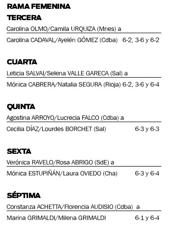 En Cuarta, las salteñas Leticia Salvai y Selena Valle Gareca se consagraron campeonas; mientras que en Quinta festejaron Agostina Arroyo y Lucrecia Falco. En Sexta, las campeonas fueron de Santiago del Estero: Verónica Ravelo y Rosa Abrigo y en Séptima hubo final cordobesa, Constanza Achetta y Florencia Audisio vencieron a Marina y Milena Grimaldi por 6-1 y 6-4 y se subieron a lo más alto del podio.