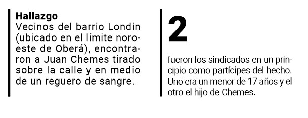 Esto no fue respetado y según lo que dictó la investigación judicial en su etapa de instrucción, Juan Chemes fue interceptado por su hijo en un camino vecinal del lote 34 del barrio Londin. Lo encontraron degollado, con profundos cortes en el cuello que lo hicieron morir desangrado. Era el 18 de marzo de 2022.