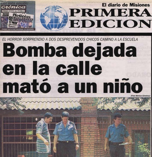 - La bomba estalló a las 6.30 frente al portón del garaje del médico Hugo Fernando Salazar del Risco y provocó la evisceración del niño Jorge Brítez y graves lesiones a Maxi Piris. Ambos se dirigían a la Escuela 272.