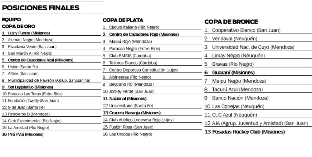 En la Copa de Plata, Centro de Cazadores Rojo llegó a la final pero no pudo con Círculo Italiano de Río Negro y debió conformarse con el segundo lugar; mientras que Nacional fue 11° y Crucero Naranja finalizó 13°. En la Copa de Bronce, Guaraní terminó en la sexta posición y Posadas Hockey finalizó 13°.