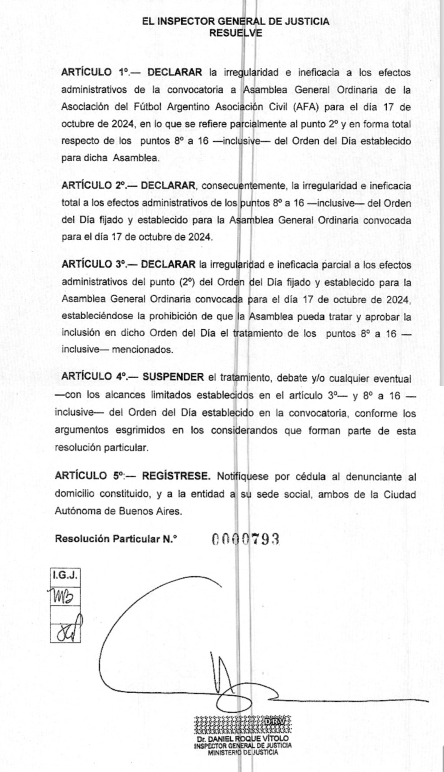 Finalmente la Inspección General de Justicia (IGJ) dejó sin efecto la asamblea ordinaria de AFA que se celebrará este jueves 17 de octubre donde se proclamaría a Claudio “Chiqui” Tapia como reelecto presidente de la Asociación del Fútbol Argentino.