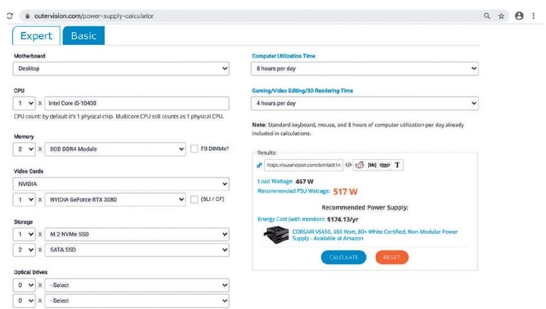 Además de “Outervision”, existen otras aplicaciones web, como la Calculadora PSU de “be quiet”. De manera similar en funcionamiento, ingresamos la marca y modelo del procesador, modelo de tarjeta gráfica, modelo de ventilador y otros datos del sistema para obtener una aproximación del consumo eléctrico de la PC.