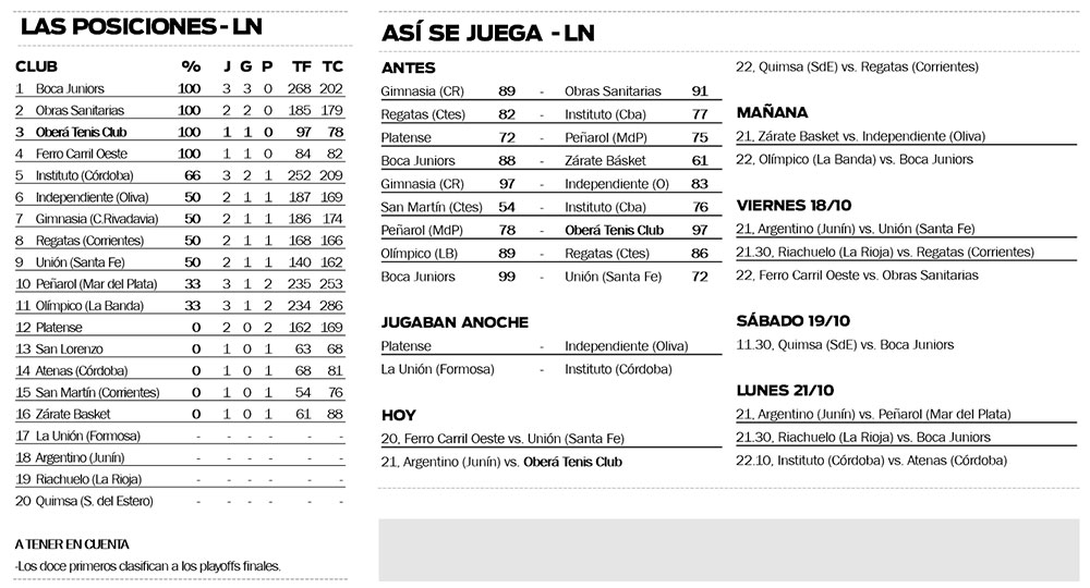Otros dos partidos se disputarán también hoy. En Caballito, Ferro recibirá a Unión, mientras que en Santiago del Estero, el siempre candidato Quimsa debutará frente a Regatas de Corrientes.