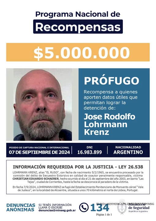 El Ministerio de Seguridad ofrece una recompensa millonaria para capturar a “El Ruso” Lohrmann, quien se fugó de una cárcel en Portugal a principios de septiembre. El hombre está acusado de ser el principal sospechoso del secuestro del correntino Cristian Schaerer en 2003.