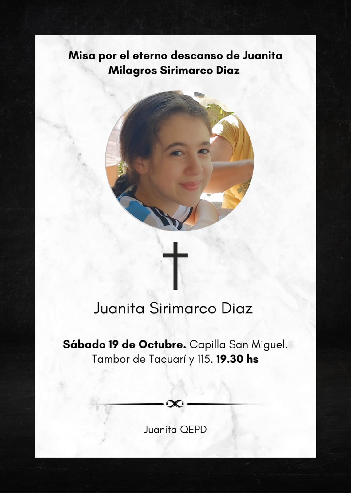 Familiares y amigos se reunirán en la Capilla San Miguel, ubicada en la intersección de Tambor de Tacuarí y 115, en Posadas, para celebrar una misa en honor a la memoria de Juanita Milagros Sirimarco Díaz, la joven misionera de 13 años que murió tras regresar de su viaje de egresados a Córdoba.