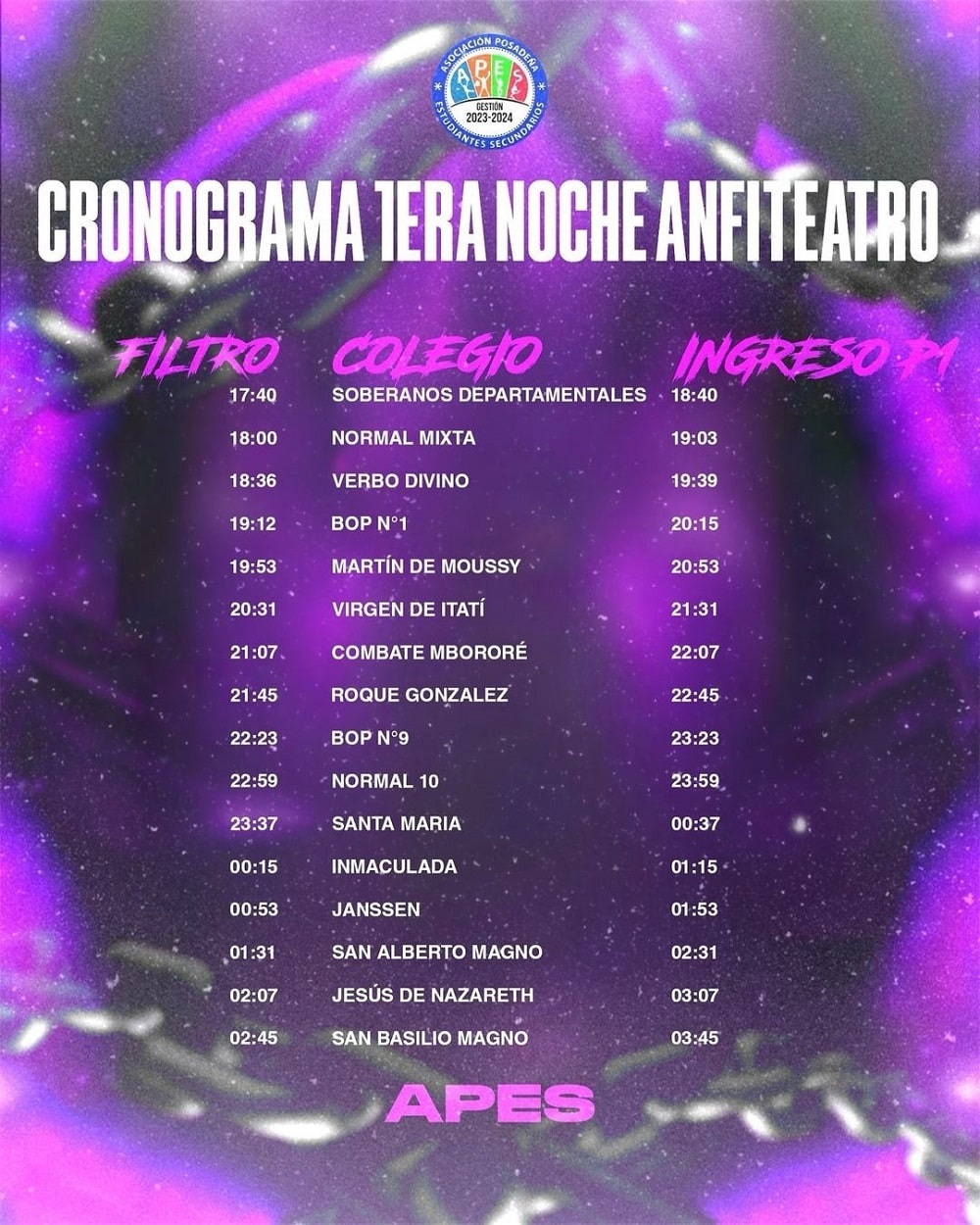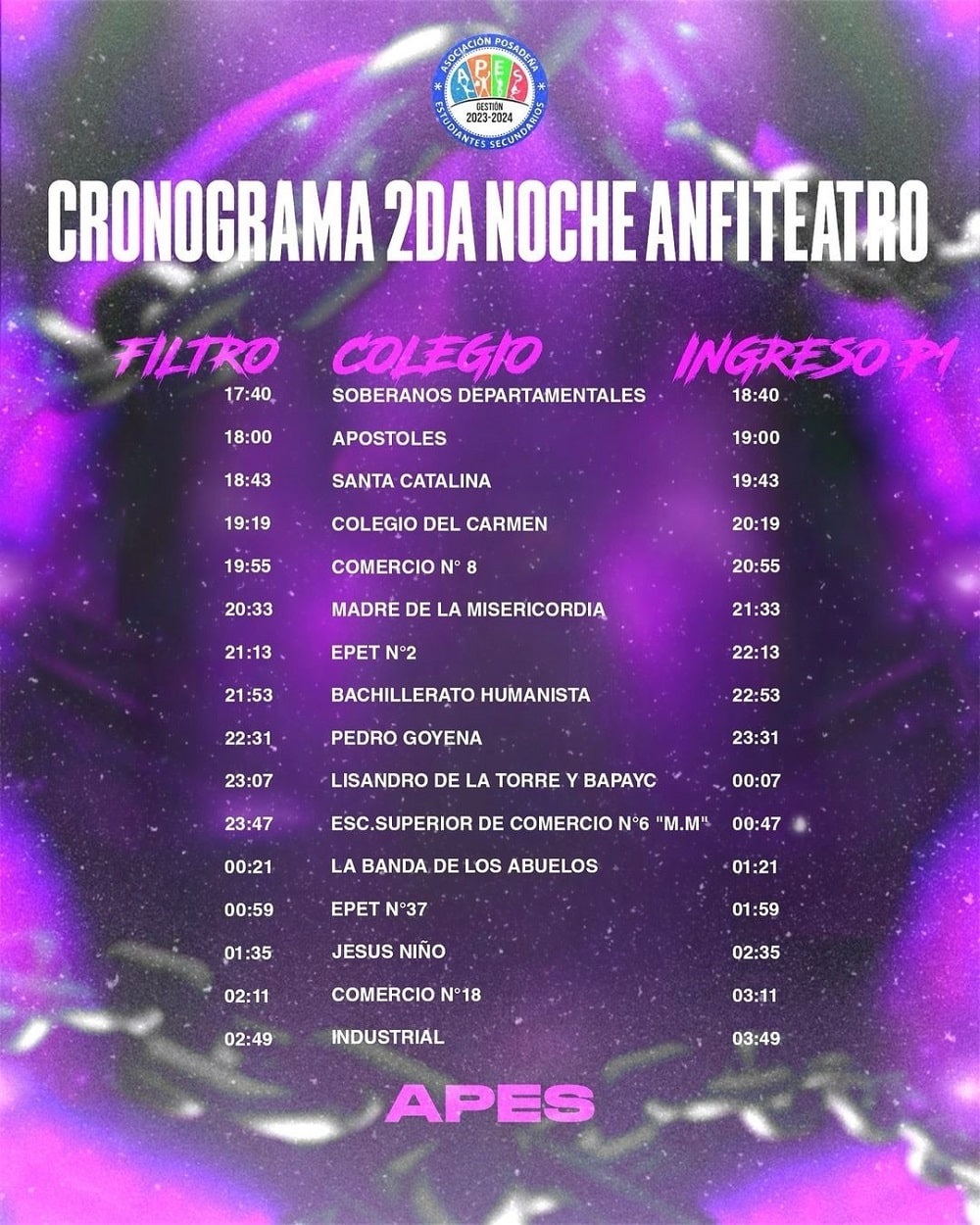 La Asociación de Estudiantes Secundarios de Posadas (APES) publicó el cronograma de salidas de los colegios que participarán en el Show de Scolas que se desarrollará en dos jornadas divididas: entre el viernes y el sábado. El epicentro de esta gran celebración estudiantil que esta edición cuenta con una participación récord de 28 colegios, que se congregarán en el clásico escenario del anfiteatro Manuel Antonio Ramírez, de Posadas.