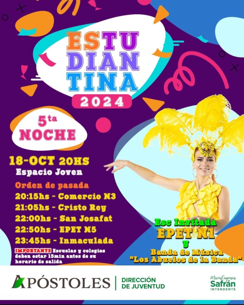 Este viernes 18 de octubre desde las 20 horas se llevará a cabo el esperado cierre de la Estudiantina Apostoleña 2024 en el Espacio Joven de esa localidad. Después de cuatro noches llenas de energía, bailes y batucadas, la jornada promete coronar una edición inolvidable de este evento que resalta el talento y la alegría de los estudiantes de la región.