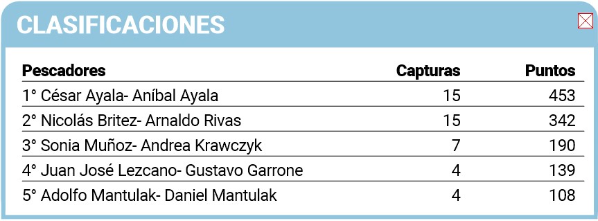 César Ayala, de la barra Kalambre, y su papá Aníbal, se coronaron campeones de la pesca de la boga durante la última edición de las 20 Horas. Los posadeños obtuvieron quince capturas, al igual que Nicolás Brítez y Arnaldo Rivas, pero en la sumatoria de centímetros sacaron 111 puntos de diferencia para desatar el festejo en el escenario del Pira Pytá. El último escalón del podio fue para un equipo femenino.