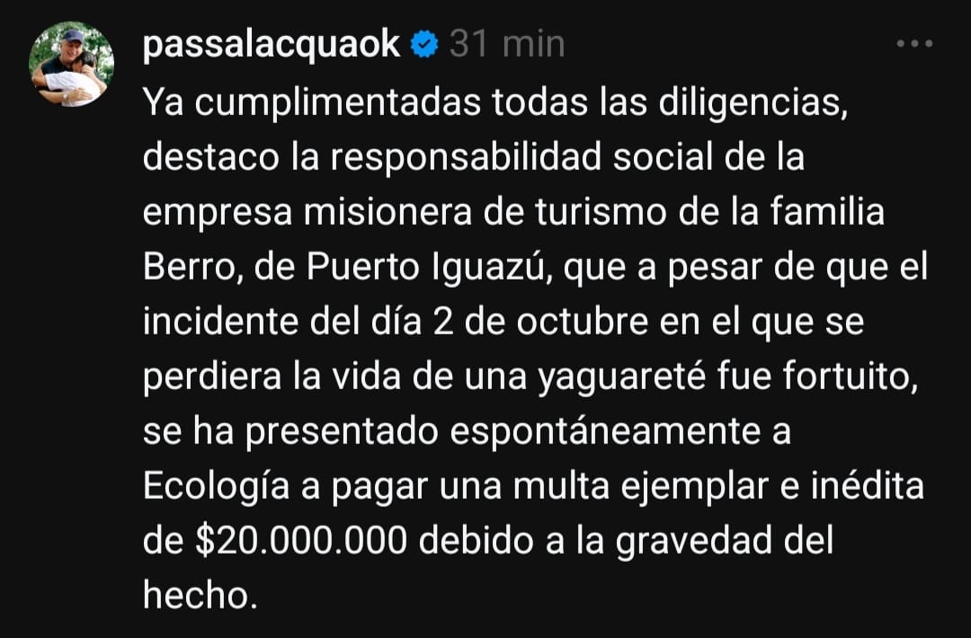 Esta tarde, el gobernador de Misiones, Hugo Passalacqua, confirmó que los responsables de la empresa de turismo propietaria del vehículo que el 2 de octubre ocasionó la muerte de una yaguareté, se presentaron espontáneamente al Ministerio de Ecología a pagar “una multa ejemplar e inédita” de $20.000.000 como consecuencia del trágico hecho.