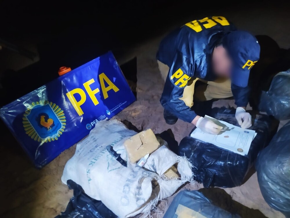 Entonces, los efectivos policiales comenzaron a rastrillar todo el terreno y con la asistencia del can detector Laila hallaron los bolsones, que en total eran 47 bultos envueltos en nylon de color negro, diez de los cuales contenían 292 “ladrillos” de marihuana, que, sumados a los 37 paquetes restantes con flores de cannabis, arrojó un peso total de 582 kilos de esa sustancia.