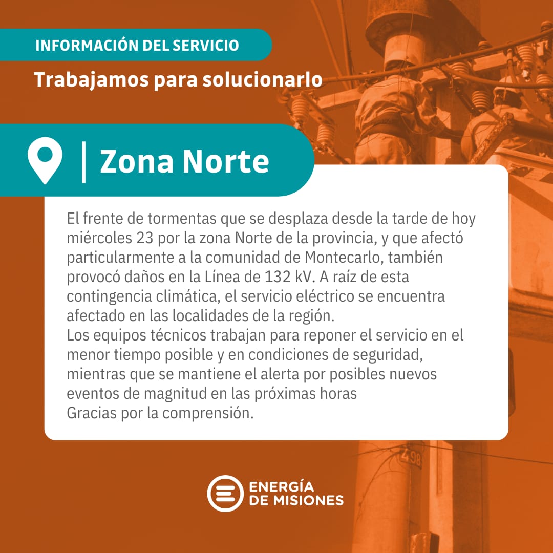 El paso del temporal afectó también la línea de 132 kV que es troncal. Están trabajando hace horas para solucionar el desperfecto que provoca que la zona comprendida desde Montecarlo hacia el Norte, tenga fallas en el servicio eléctrico.