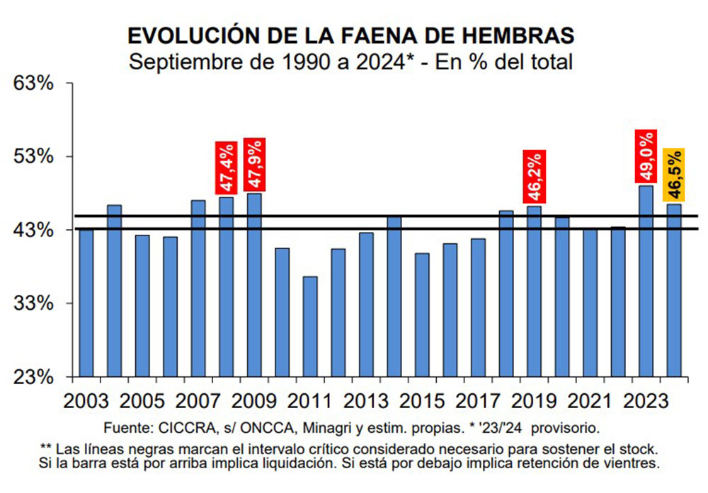 El informe reveló que “en los primeros nueve meses de 2024 se produjeron en el país 2.336 millones de tn r/c/h de carne vacuna”, lo que “representó una caída de 6,4 % con relación a enero-septiembre de 2023”, en tanto que “en términos absolutos, la retracción de la cantidad ofrecida de carne vacuna fue de 159.800 tn r/c/h”.