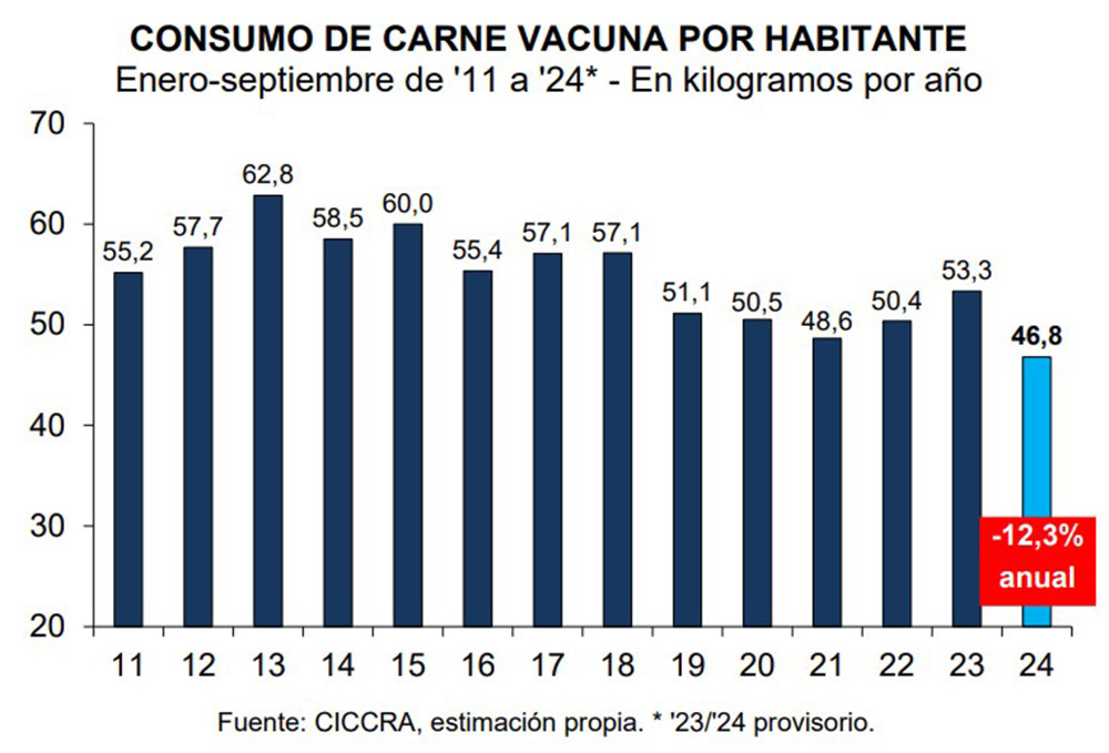 Durante los primeros nueve meses de 2024, el promedio por persona fue de 46,8 kilos al año. En septiembre, la merma en el aumento de los precios no se condijo con un repunte de la demanda.