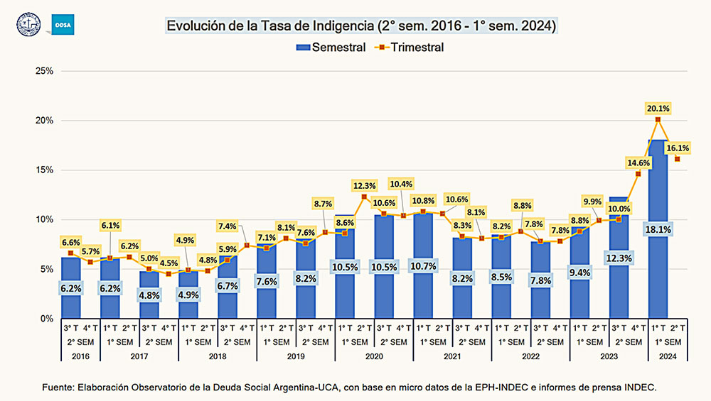 El anuncio libertario contrasta notablemente con las últimas mediciones proporcionadas por el INDEC en septiembre, que arrojaron un alarmante 52,9% de pobres (indicador que trepó 11,2 puntos porcentuales respecto del segundo semestre de 2023) y 18,1% de indigencia en el país.