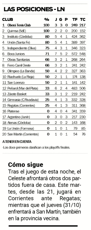 La meta será, entonces, extender la racha, que arrancó en el debut con triunfo ante Peñarol en Mar del Plata (97-78); prosiguió con victoria en Junín sobre Argentino (76-67) y tuvo un tercer capítulo en el debut en casa, en el Luis Derna obereño, con festejos ante Gimnasia y Esgrima de Comodoro Rivadavia, por 76-72.