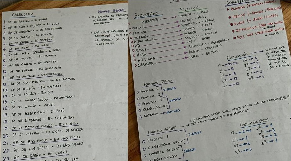 Desde las fechas, la obtención de puntos, las pruebas y clasificación, corredores hasta los pilotos de cada escudería fueron parte de los apuntes dejados a su novia.