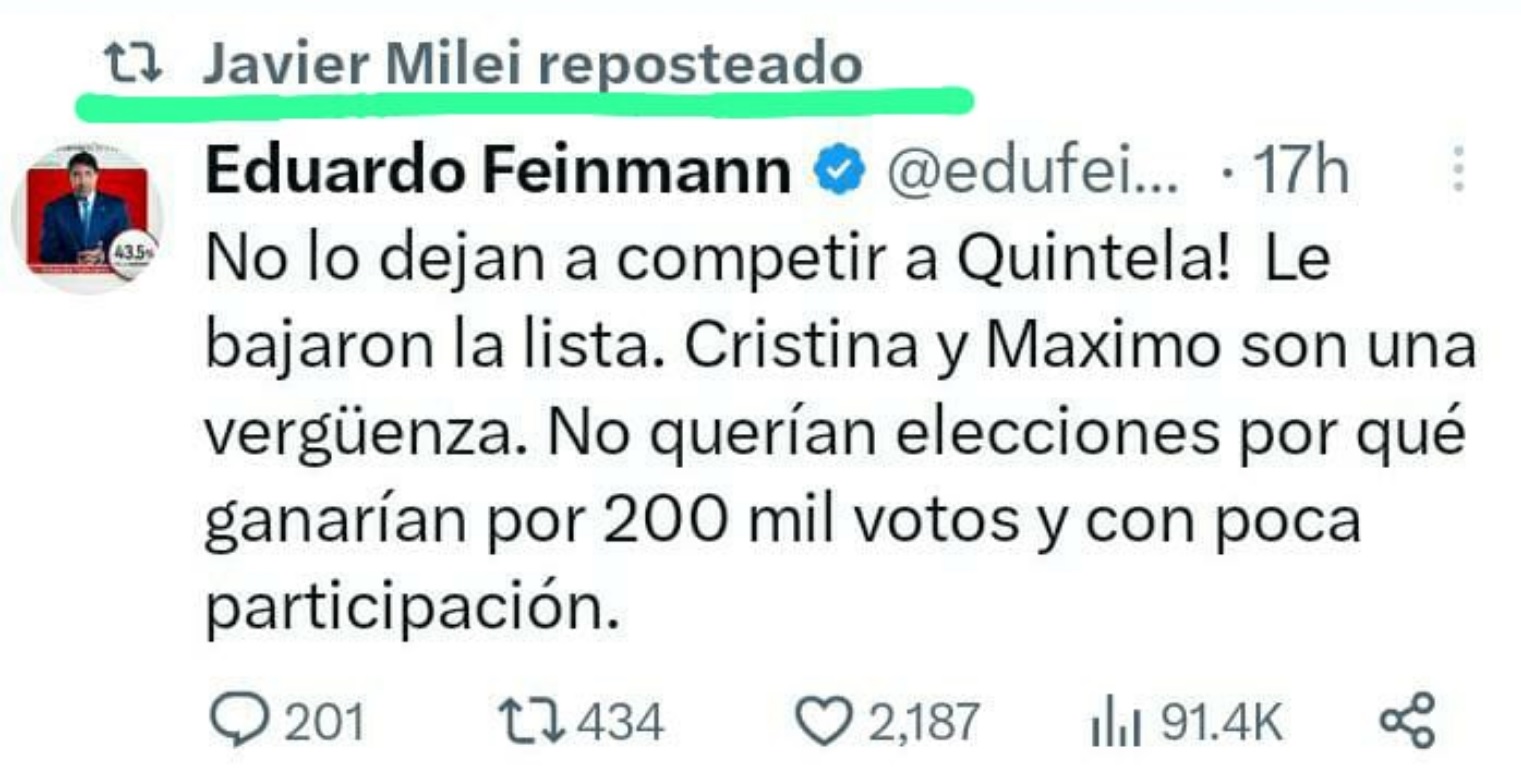 Horas después, el presidente de la Nación, Javier Milei, compartió un posteo en la red X del periodista de La Nación+ Eduardo Feinmann que sostuvo: “No lo dejan a competir a Quintela! Le bajaron la lista. Cristina y Maximo son una vergüenza. No querían elecciones por qué ganarían por 200 mil votos y con poca participación”.