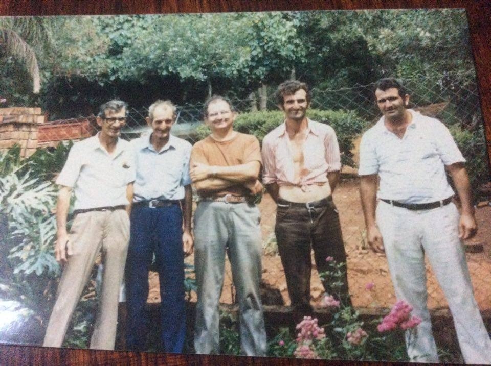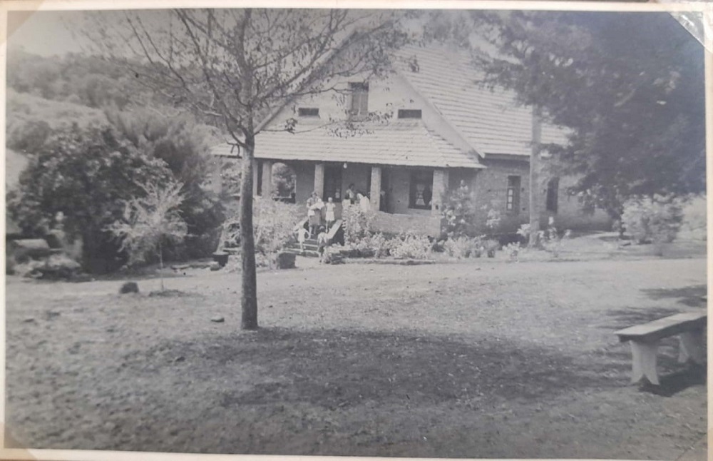 La casa vista desde el norte con sus amplias galerías y en el fundamento la puerta que daba al gallinero. En primer plano, los murallones de piedra que contenían a la huerta y los frutales. Del lado norte, es decir, pendiente abajo, se hicieron algunos murallones con piedras para conformar la huerta y la quinta. Canteros con verduras y dos largas hileras de frutales daban mandioca, zapallos, choclos y mucho verdeo para la cocina. De los árboles frutales se cosechaban peras, manzanas, granadas e incluso uvas y zarzamoras. Debajo de la casa, en una especie de sótano abierto, se estableció el gallinero. Los chiqueros y el tambo con espacio para los carros, luego camioneta y tractor, tenían lugar en una construcción paralela a la casa. En poco tiempo estaba desmontada la selva para dar lugar al potrero en todo el valle del arroyo, a los yerbales, los tungales y luego las plantaciones de naranja que en los años 50 dieron una profusa cosecha para la cooperativa de la cual el Opa fue cofundador. En los años 70, la Oma, ya viuda, fue una de las pioneras en plantar Kiri, plantas para madera liviana promocionada por los japoneses.