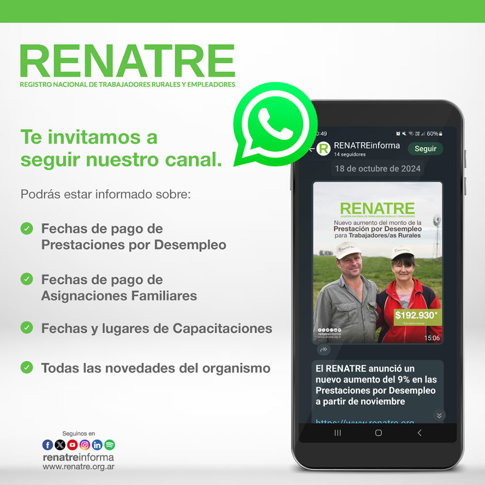 El Registro Nacional de Trabajadores Rurales y Empleadores (RENATRE) presentó su nuevo canal oficial de Whatsapp: “Renatreinforma”, con el objetivo de facilitar el acceso a información actualizada y mantener a los trabajadores rurales y empleadores al tanto de las novedades del organismo.