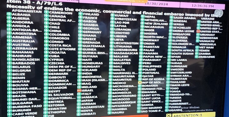 La Asamblea General de las Naciones Unidas aprobó este miércoles, por abrumadora mayoría, una resolución que pide el fin del embargo de Estados Unidos a Cuba, en lo que la isla caribeña denomina “bloqueo”. Con 187 votos a favor, 2 en contra (EE.UU. e Israel) y una abstención de Moldavia, esta resolución es la número 32 en condenar las restricciones que, según el país caribeño, afectan profundamente su economía y el bienestar de su pueblo. Sin embargo, la sorpresa del día vino con el voto de Argentina.