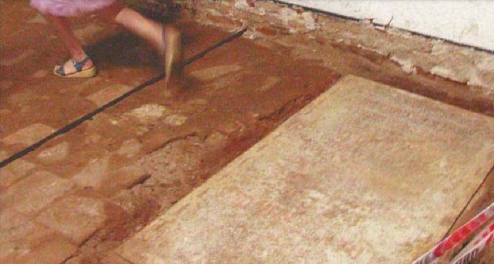 La placa de mármol, de unos 70 centímetros por un metro, fue encontrada por trabajadores de la construcción que se hallaban retirando el piso cerámico del lugar. Estaba ubicada pocos centímetros por debajo del embaldosado, en el costado que da a la oficina de Mesa de Entradas.