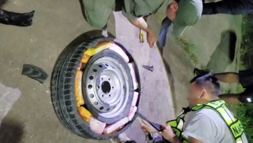 Del registro de los documentos del conductor y acompañante de la camioneta se pasó a requisar el transporte y se confirmó que la rueda de auxilio tenía marcas de un recapado dudoso. Cuando la bajaron de la caja notaron el peso excesivo y al cotejarla con un perro entrenado en detectar narcóticos, las sospechas no tardaron en confirmarse. Cortaron el neumático y los 33 panes de droga sobresalieron de inmediato. Un total de 31,384 kilogramos de cocaína de máxima pureza, indicó el pesaje y testeo.