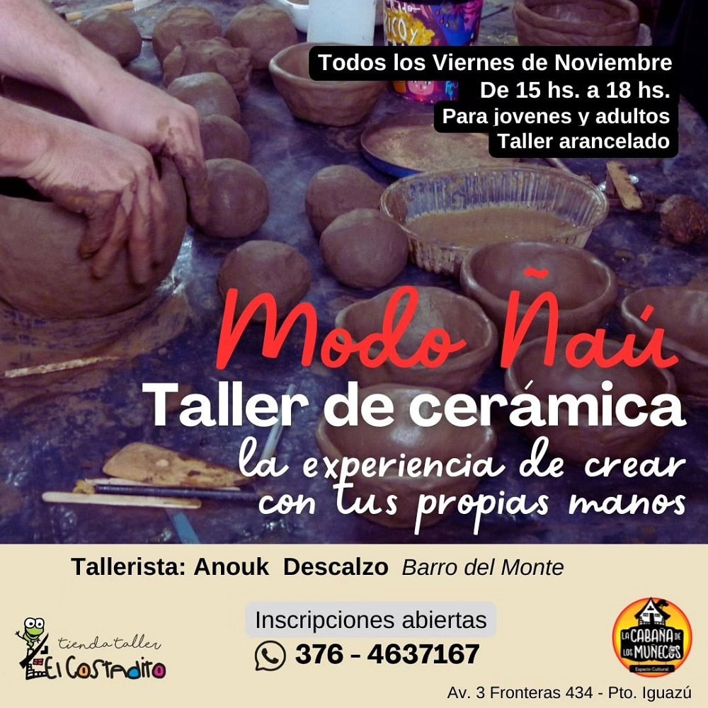 El Costadito tienda taller y La Cabaña de los Muñecos de Puerto Iguazú (Avenida Tres Fronteras 434) invitan todos los viernes de 15 a 18, a compartir la experiencia de crear utensilios con las manos. Entrada: Arancelada. El valor incluye los materiales y no se requiere experiencia previa. Consultas al 376 4637176.
